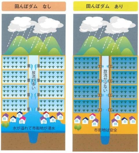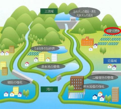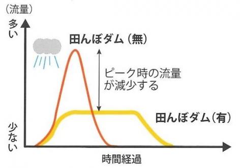 (2)排水路に流れ込む水の量を減らすことで、急な水位上昇を抑えます。