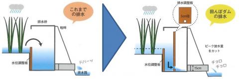 (1)田んぼの排水口を絞り、排水量を抑え、一時的に田んぼに貯められた水は、少しずつ排水路に流れます。